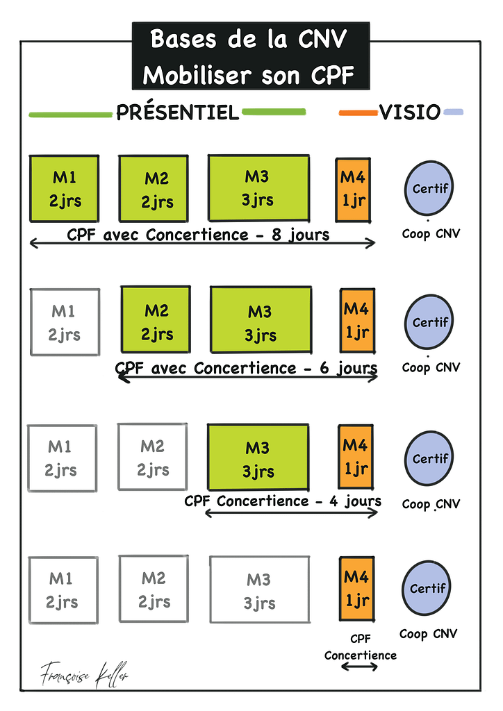 • Vous avez déja suivi 4 jours des bases de la CNV avec un formateur certifié, une formatrice certifiée du CNVC ? Vous pouvez vous inscrire avec votre CPF à la suite de votre formation, en prenant le module 3, des 14, 15, 16 mai 2025 et la préparation de la certification le 7 novembre 2025. Attention pour de dispositif, il vous faudra être rapide car les délais d’inscription au Compte Personnel Formation sont longs.